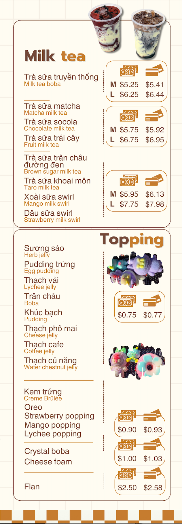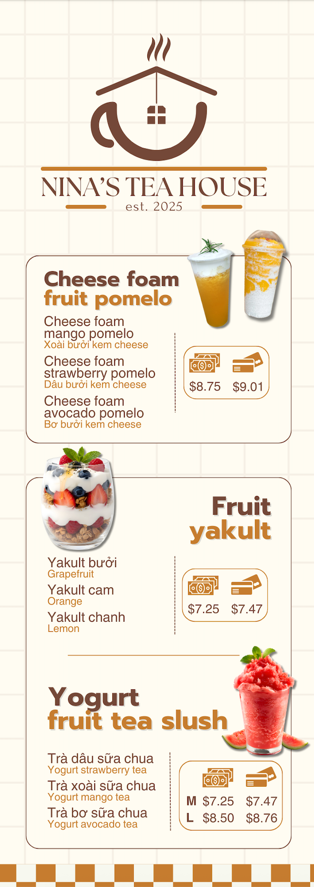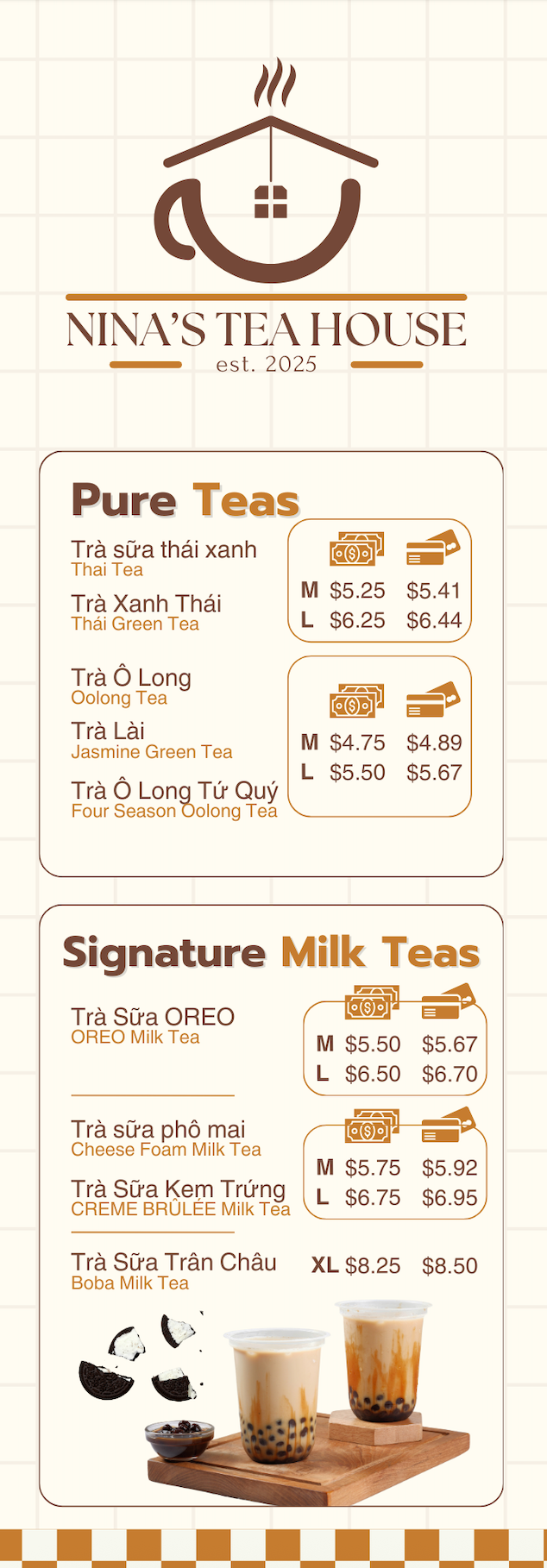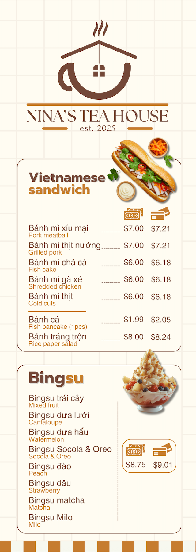 With a passion for flavor and years of experience, Nina’s Teahouse is committed to bringing you the best drinks and Vietnamese-inspired bites. From refreshing boba teas to delicious bánh mì sandwiches, snacks, and sweet treats like bingsu, we take pride in offering fresh, high-quality flavors that keep our customers coming back. Visit us today and enjoy a delightful taste experience you won’t forget.